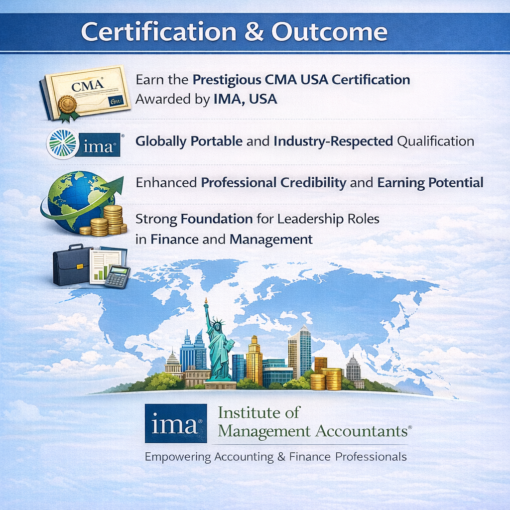 The CMA USA (Certified Management Accountant) is a globally recognized professional certification awarded by the Institute of Management Accountants (IMA), USA. It is designed for finance and accounting professionals who aim to excel in management accounting, financial planning, performance management, strategic decision-making, and corporate leadership.